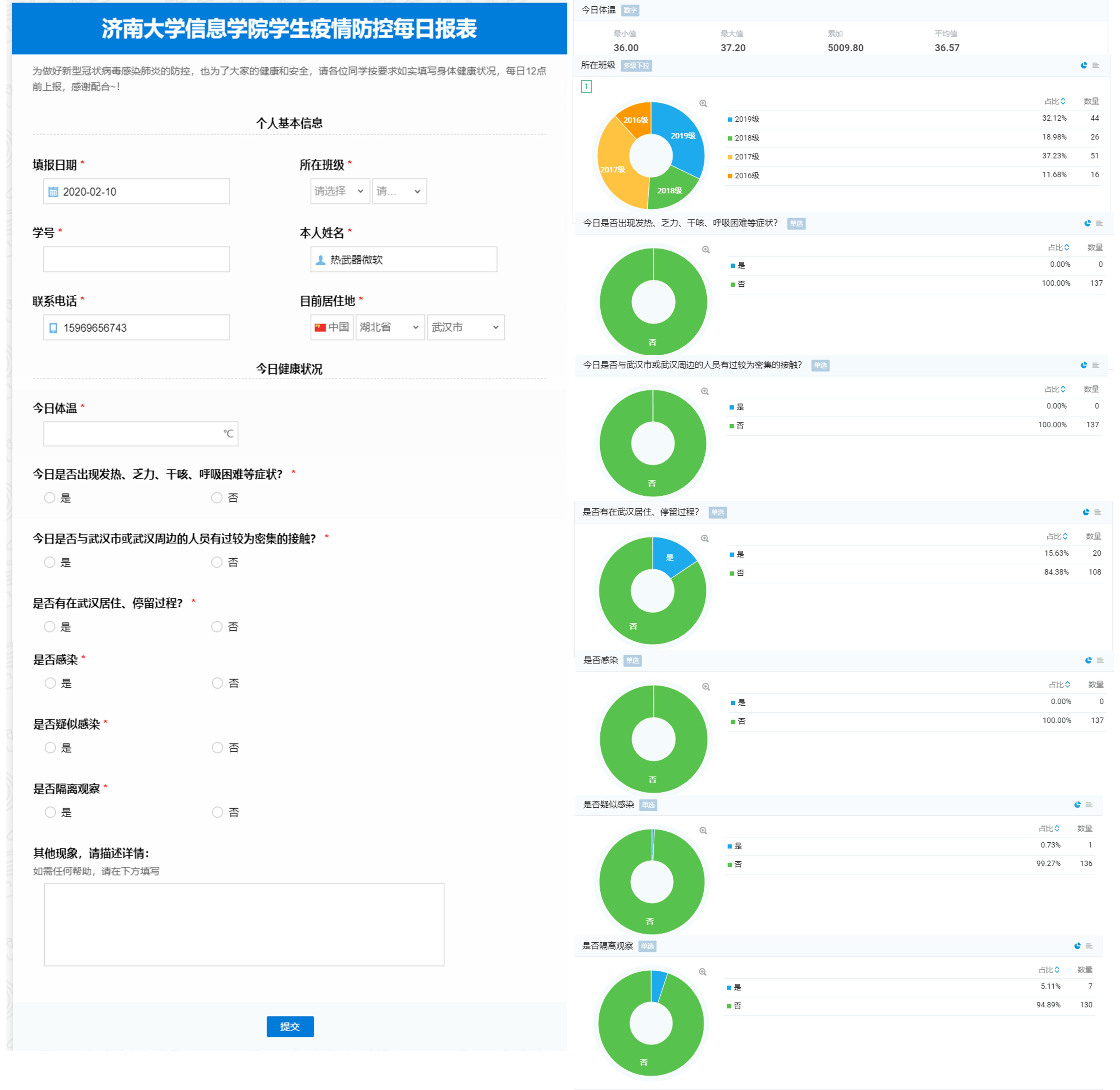 对于学院教职工,建立系部主任定期汇报制度,对本系部教师情况进行摸排汇总,并及时汇报;对全体学生,以年级、班级为单位,建立辅导员—主要学生干部—全班学生的疫情防控信息网,每日排查班级同学身体健康情况并汇总上报,实时掌握全院学生情况,并及时通过网络宣传、群发通知等方式号召同学们响应国家和学校号召,服从当地、学校、学院疫情防控工作安排,居家做好科学抗疫的带头者;对有湖北地区停留史、与相关人员有接触以及疫情较严重地区的学生及时进行完善摸排,推出“万象城娱乐awc线路信息学院学生疫情防控每日报表”系统,通过系统可快速、全面的掌握学生每日动态信息,更有针对性的做好疫情防控工作。