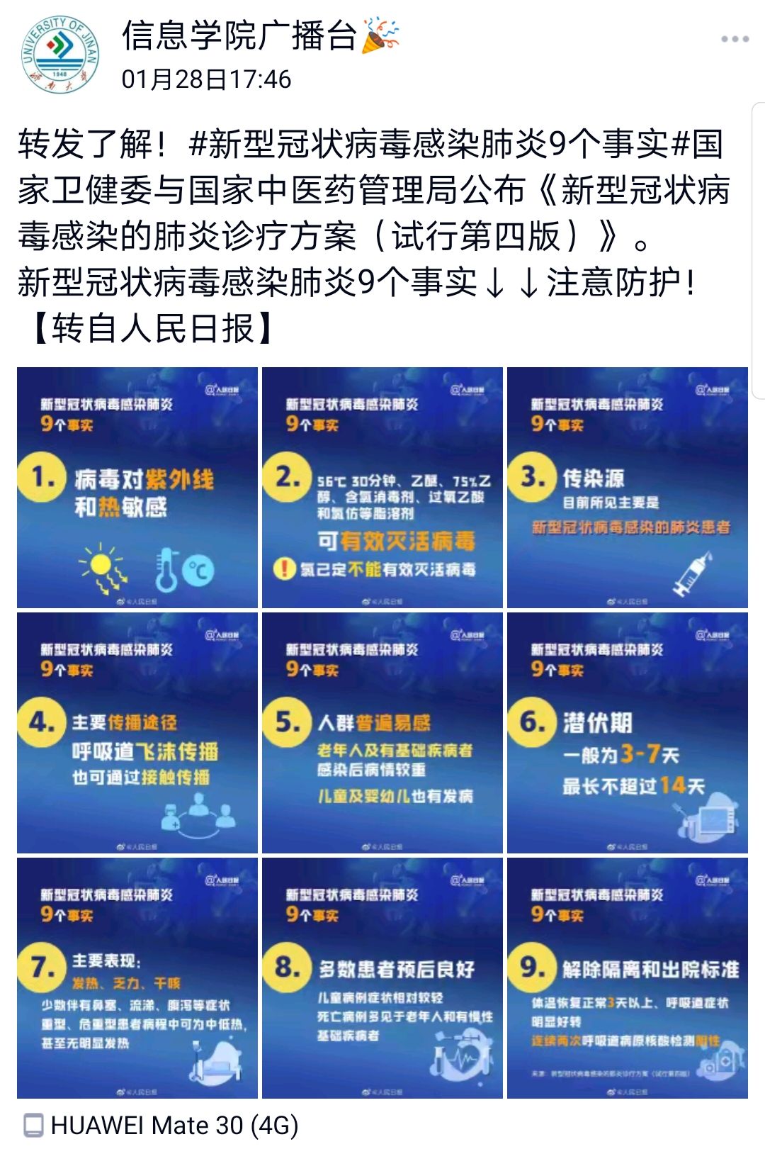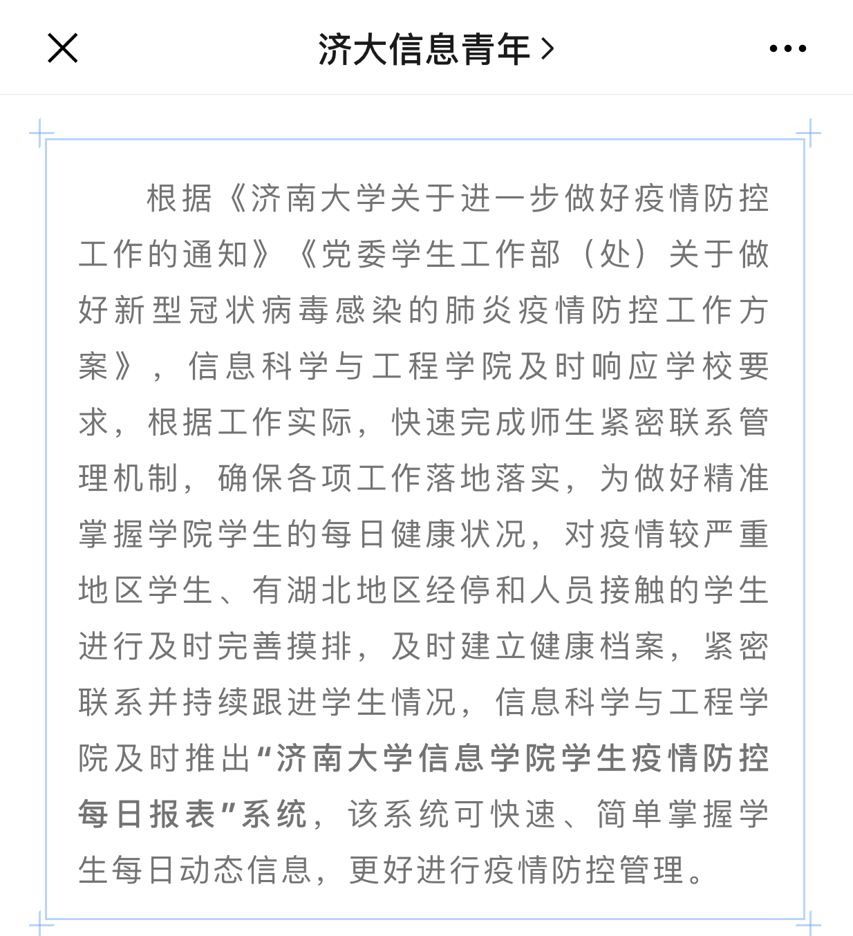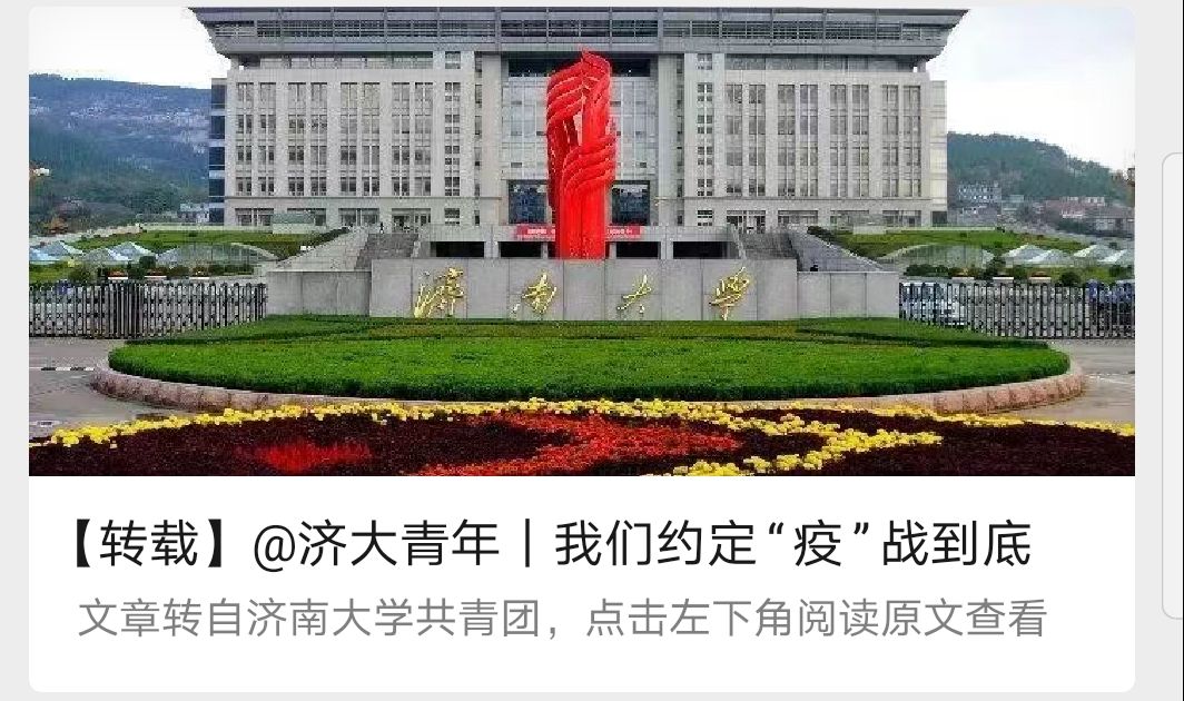 为提高全院学生新冠肺炎疫情防控意识,增强战胜疫情的信心和决心,学院积极做好疫情防控宣传工作,利用官方微信公众号、QQ群、QQ公众空间等阵地,宣传中央指示精神和学校学院防疫部署安排、普及防疫知识和要求,针对防控的各个环节、各类情况做好疫情防控的综合宣传工作,营造坚决打赢疫情防控阻击战的良好舆论环境。同时,学院在第一时间将万象城娱乐awc线路《致万象城娱乐awc线路全体学生的倡议书》、《@济大青年|我们约定“疫”战到底》通过微信推送的形式发送至每位同学并及时发布《新型肺炎的公共场所卫生防护指南》、原创微信文章《共度难关,我们在一起》,将抗疫正能量传递给信院每位青年。