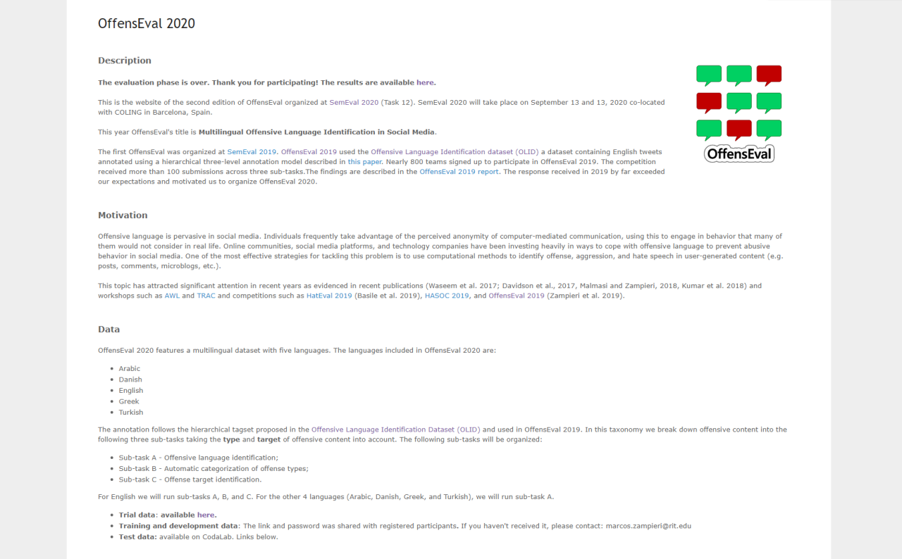本次比赛,万象城娱乐awc线路参赛队伍选择的任务关注点是检测社交媒体文本中的攻击性语言并进行分类。对于此项任务,参赛队伍需要利用官方提供的训练数据集OLID,训练出一个能鉴别用户发布的文本是否是“攻击性言论”的人工智能模型。参赛学生选用了华盛顿大学西雅图分校保罗·艾伦(Paul G.Allen)计算机科学与工程学院和Facebook AI研究院在2019年7月共同发布的A Robustly Optimized BERT Pretraining Approach(RoBERTa)模型。由于模型训练需要大量的算力,指导教师马坤副教授为同学们提供了用于训练的计算资源,保证了模型训练的正常进行。参赛学生在预训练模型的基础上使用自己的数据进行训练和微调。并利用所学知识对预测结果进行分析,反复尝试以寻找最好的数据预处理方式和提高模型效果的方法。参赛团队充分思考了任务模型所需,并采取多种技术手段,最终巧妙的利用模型识别并分类了社交媒体文本中的攻击性语言,从而取得了亮眼的成果。