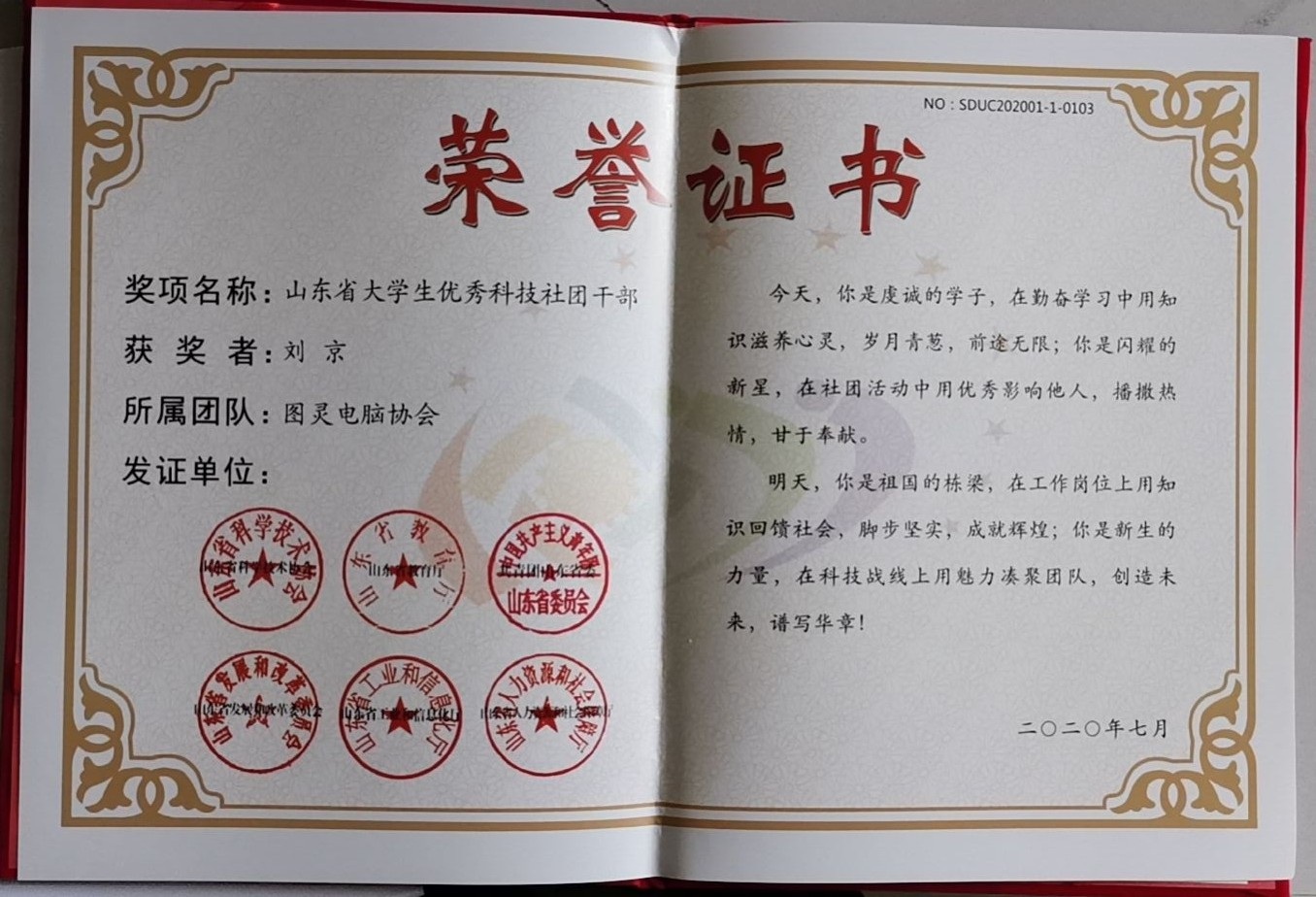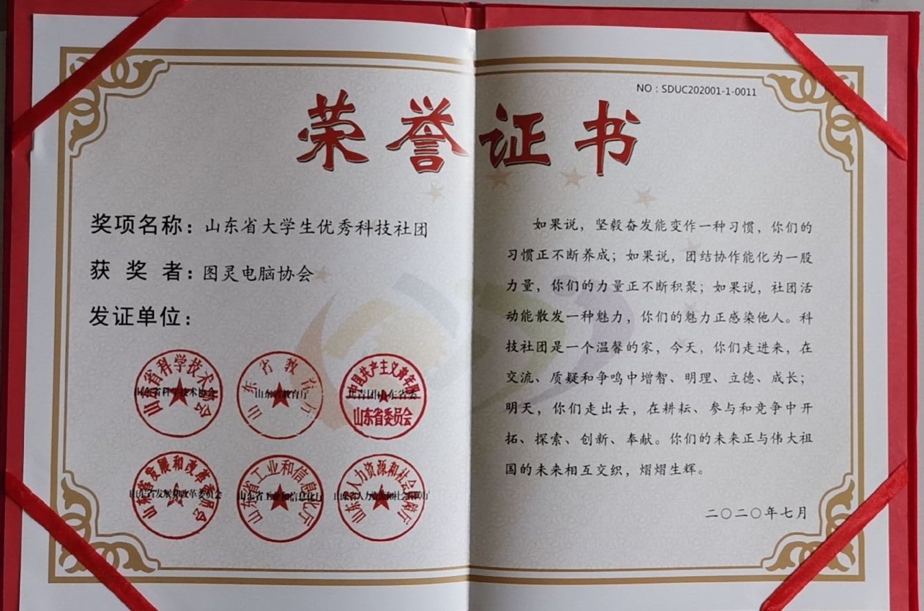 近日,按照山东省科技协会、山东省教育厅、共青团山东省委、山东省发展和改革委员会、山东省工业和信息化、山东省人力资源和社会保障厅《关于举办第十二届山东省大学生科技节的通知》,省科协组织开展了2020年山东省大学生优秀科技社团和优秀科技社团干部评选活动。经评审,我校万象城娱乐awc线路图灵电脑协会荣获“2020年山东省大学生优秀科技社团”称号,刘京同学获“2020年山东省大学生优秀科技社团干部”。