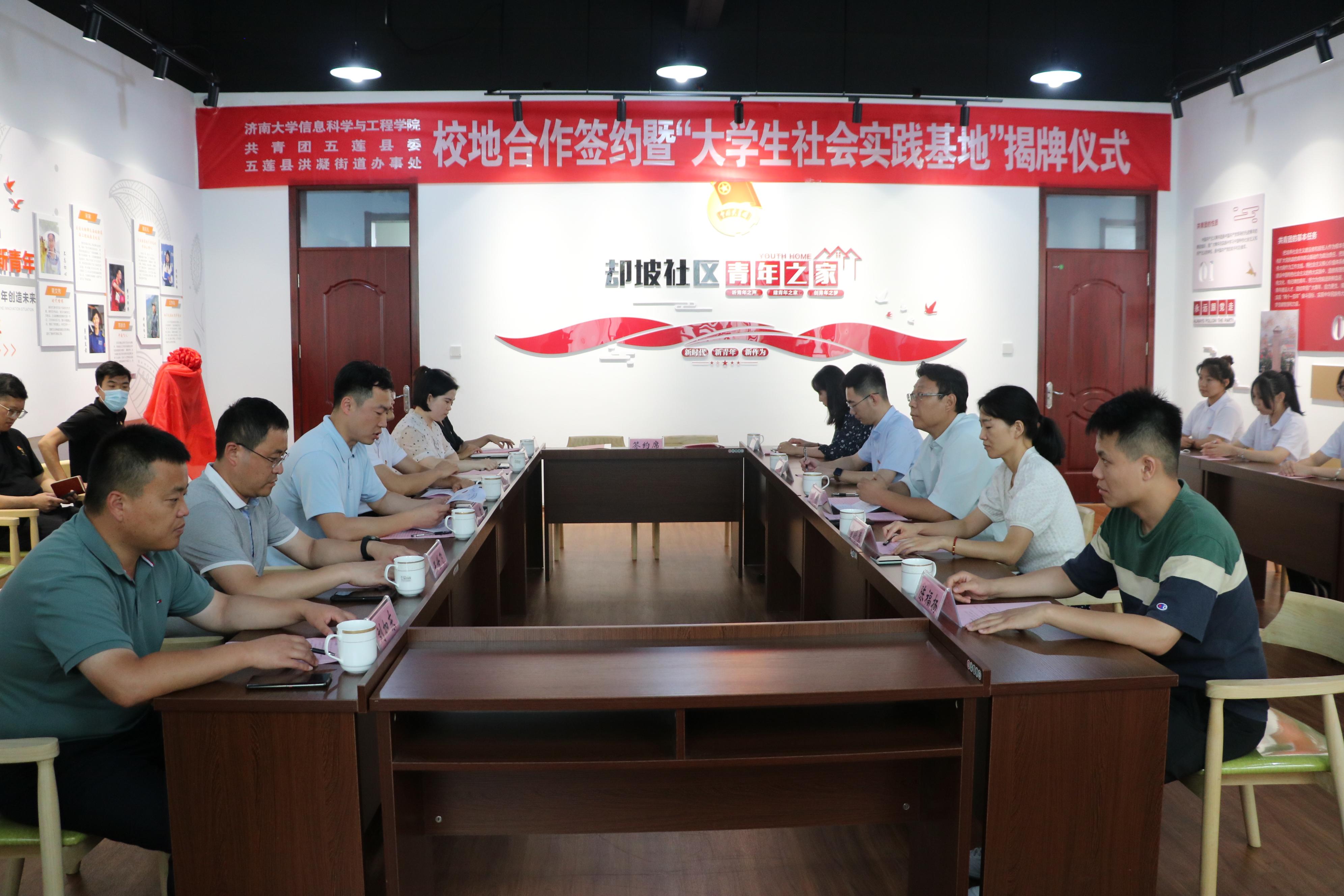 学院分别与五莲团县委、五莲县洪凝街道办事处签订校地合作协议,徐哲副县长和李超书记共同为“大学生社会实践基地”揭牌。签约仪式结束后,与会领导一行在却坡社区调研青春社区有关工作。