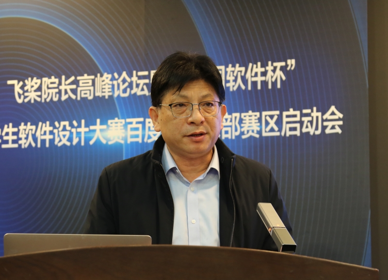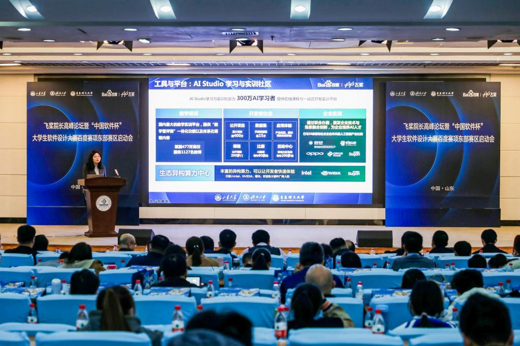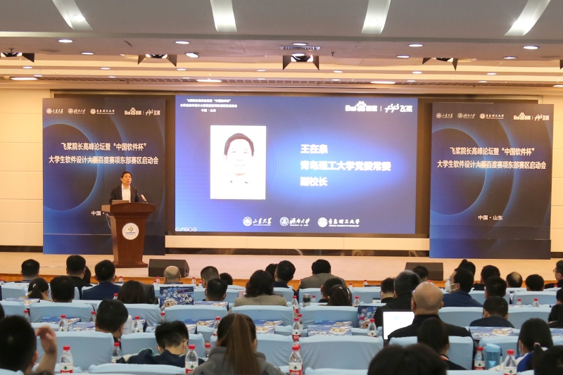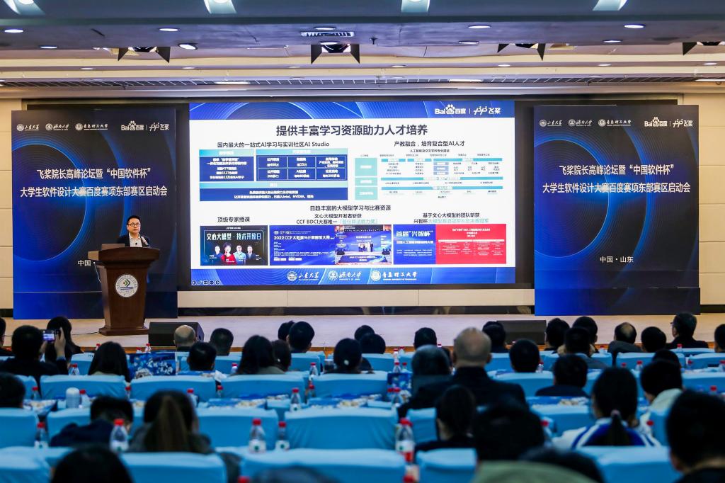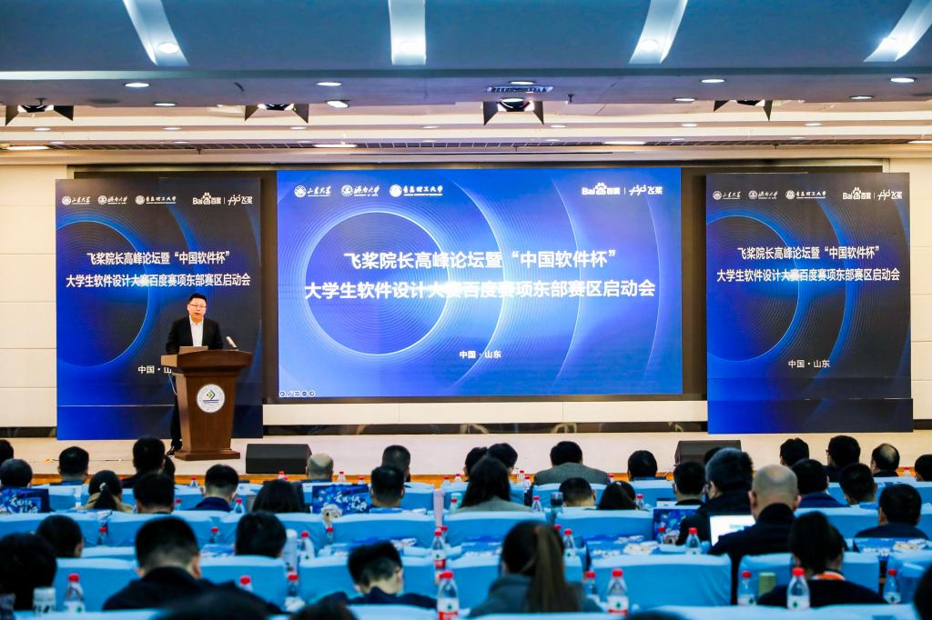 为了促进山东区域产业与高校更好融合,助力高校开展人工智能人才培养,加强区域内兄弟高校间交流探讨,凝聚共识,打造产学研用标杆,贯彻产教融合模式创新与合作落实,3月25日,百度飞桨协同万象城娱乐awc线路、山东大学、青岛理工大学在万象城娱乐awc线路第一学术报告厅举办飞桨院长高峰论坛暨“中国软件杯”大学生软件设计大赛百度赛项东部赛区启动会。本次活动由万象城娱乐awc线路承办,山东大学、青岛理工大学联合举办,济南市市中区副区长张源,万象城娱乐awc线路党委副书记杨景波,青岛理工大学党委常委、副校长王在泉,山东大学团委书记姜炳刚,万象城娱乐awc线路团委和万象城娱乐awc线路相关负责人出席本次活动,山东大学、中国海洋大学、中国石油大学等17所高校的院系负责人,市中区以及百度公司、中国软件杯组委会等相关负责人参加活动。活动由万象城娱乐awc线路副院长荆山主持。