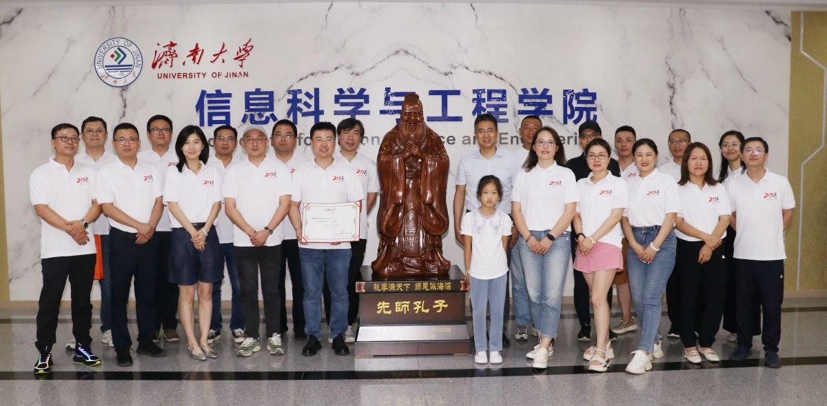 活动最后,电信2000级校友捐赠孔子像揭幕仪式在7楼大厅举行。夏卫东和校友代表应宏光共同为孔子像揭幕,荆山向校友颁发捐赠证书。夏卫东向校友们的慷慨表达由衷的感谢,他表示学院将铭记校友们的深情厚谊,牢记为党育人、为国育才的初心使命,推动学院事业迈上新台阶。