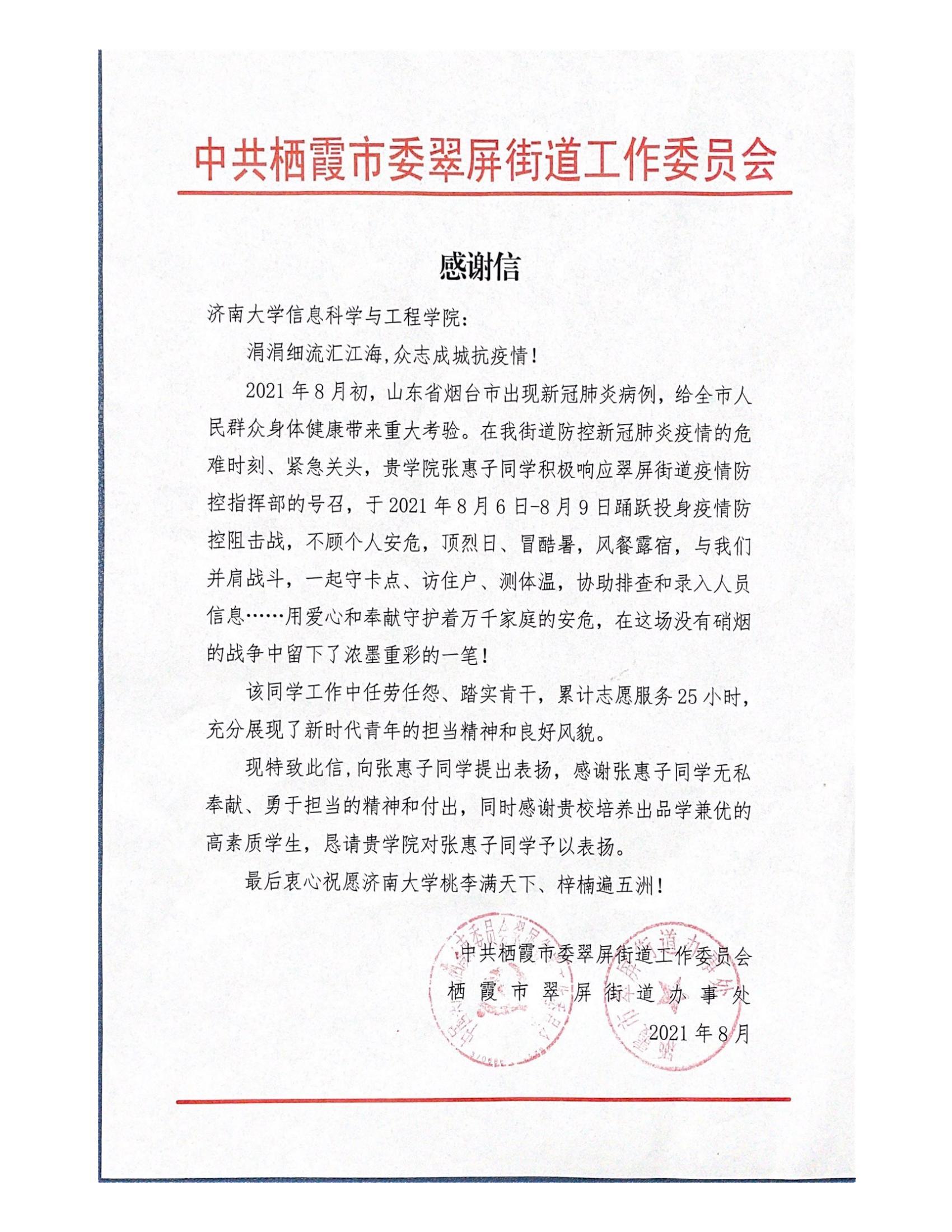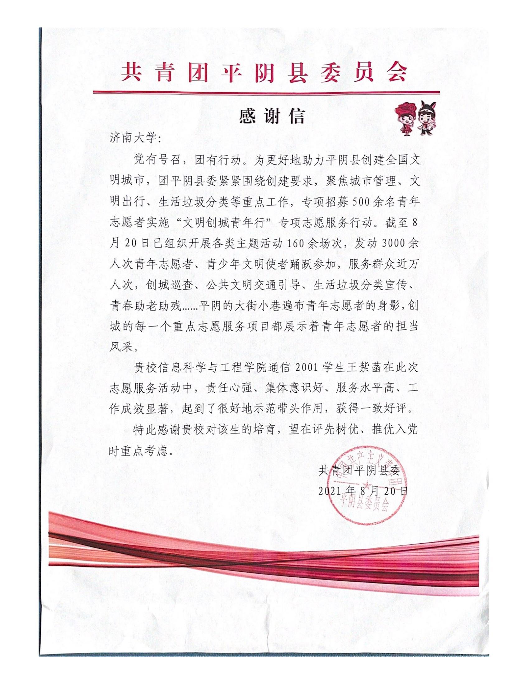 近日,万象城娱乐awc线路收到来自共青团平阴县委员会和中共栖霞市翠屏街道工作委员会的感谢信,感谢万象城学生王紫菡和张惠子在志愿服务活动中的积极表现以及担当精神。
