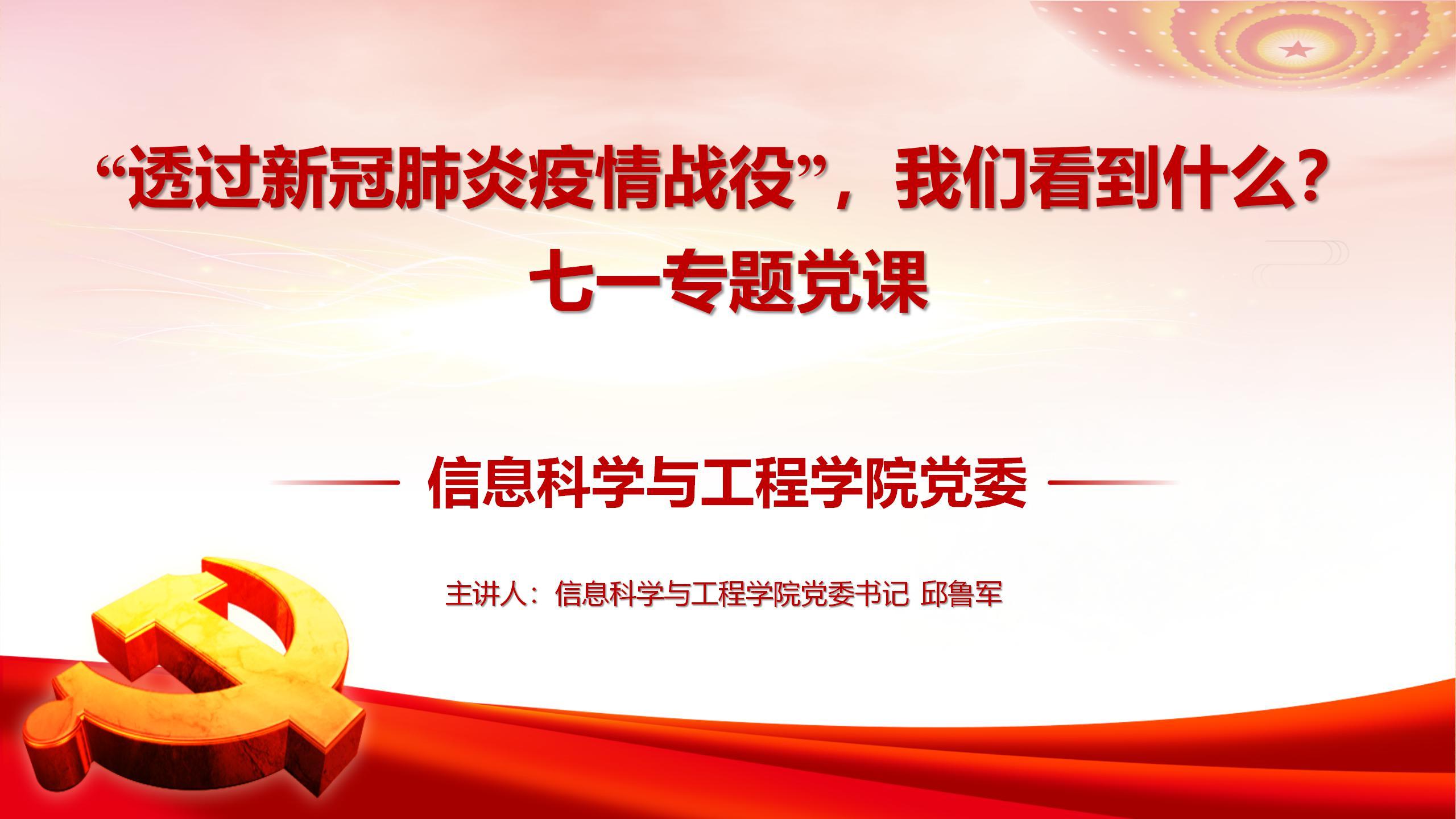 为庆祝中国共产党成立99周年,深入学习贯彻习近平新时代中国特色社会主义思想,切实增强全院师生党员政治意识、大局意识、核心意识、看齐意识,6月30日下午,万象城娱乐awc线路党委书记邱鲁军以《透过新冠肺炎疫情战役,我们看到了什么》为主题,为全院师生党员讲授了一场生动的专题党课。党课由院长陈贞翔主持。