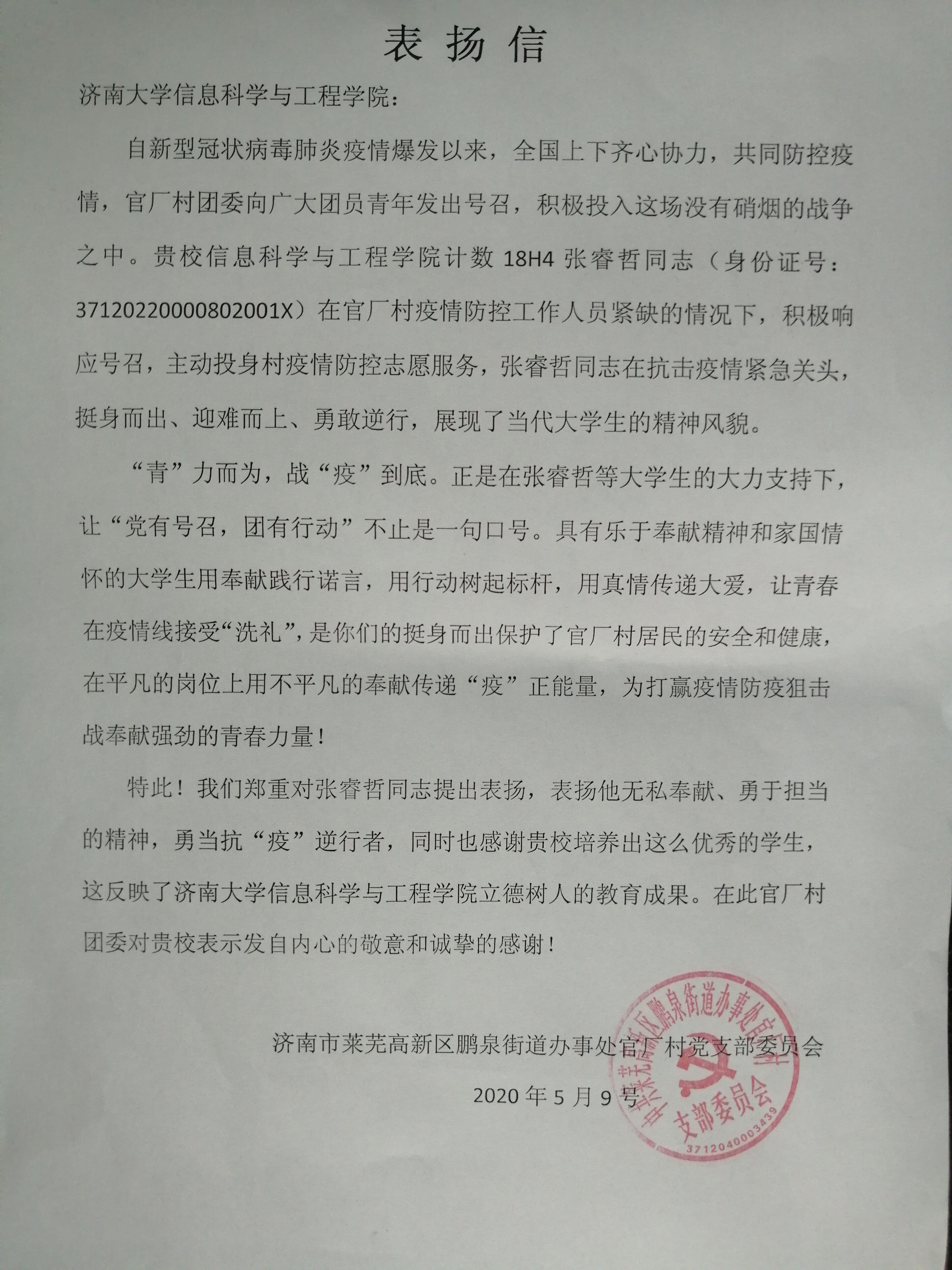 2020年5月14日,万象城娱乐awc线路收到一封来自“济南市莱芜高新区鹏泉街道办事处官厂村党支部委员会”的感谢信,感谢万象城大学生计数18H4张睿哲同学为当地的疫情防控做出的贡献,赞扬张睿哲同学这种无私奉献的精神。