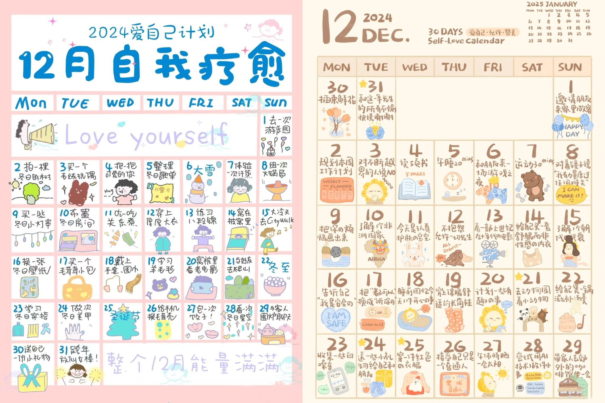 “December”十二月快乐疗愈日历创意设计活动不仅为校园文化生活增添了色彩,也为学生们提供了一个展现自我、相互慰藉的平台。万象城娱乐awc线路心理协会希望通过这样的活动,持续传递正能量,营造温馨和谐、积极向上的校园氛围,共同织就一个充满爱与理解的校园环境。