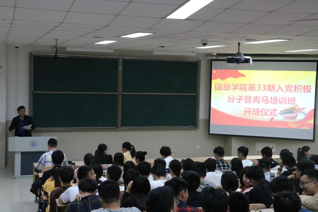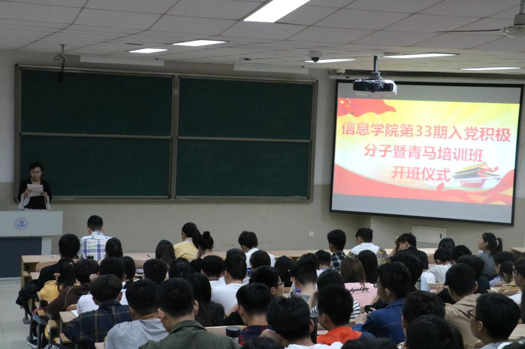 为全面贯彻党的十九大精神,顺应中华人民共和国成立70周年的大好形势,5月9日晚6点20,信息学院在11教6101教室开展第33期入党积极分子暨青马培训班开班仪式,信息学院党委书记邱鲁军,信息学院党委副书记、副院长董晓宁,信息学院团委书记崔艺馨,18级辅导员王群,17级辅导员王豪及二百余名入党积极分子出席开班仪式。