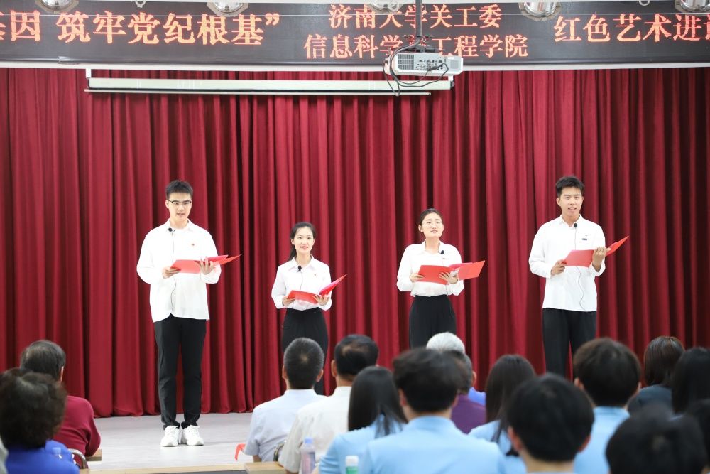 活动开始前,学校关心下一代工作委员会秘书长、离退休工作处处长高卫红和万象城娱乐awc线路党委书记夏卫东分别致辞,介绍了活动背景、活动目的和意义。活动在经典红色朗诵《孔繁森之歌》中拉开帷幕,朗诵者声情并茂的讲述了“青山处处埋忠骨,一腔热血洒高原”孔繁森的感人事迹。随后,济南市朗诵艺术家协会主席华青等十余位校内外老艺术家、老教师带来了《英雄本色》《我是共产党员我没有忘记》《一双布鞋和满坡的迎春花》《人生岁月》等红色经典文艺作品,讲述了以“失踪”33年的志愿军战士柴云振为代表的革命先烈的英雄事迹。万象城娱乐awc线路原工会主席张洪安创作的《济大的秋天》深情讲述了学校建校75周年艰辛光荣的发展历程,表达了学校全体师生争创“一流”的坚定决心和信心。万象城娱乐awc线路廉扬等学生党员的诗朗诵《廉洁颂》则向党组织表达了新时代青年坚守初心使命、铭记修身立德的郑重承诺。万象城娱乐awc线路组织员李童童以一首《又唱浏阳河》将现场气氛带到高潮,现场气氛热烈,掌声阵阵。最后,文艺展演在全体党员齐声合唱《歌唱祖国》中落下帷幕。