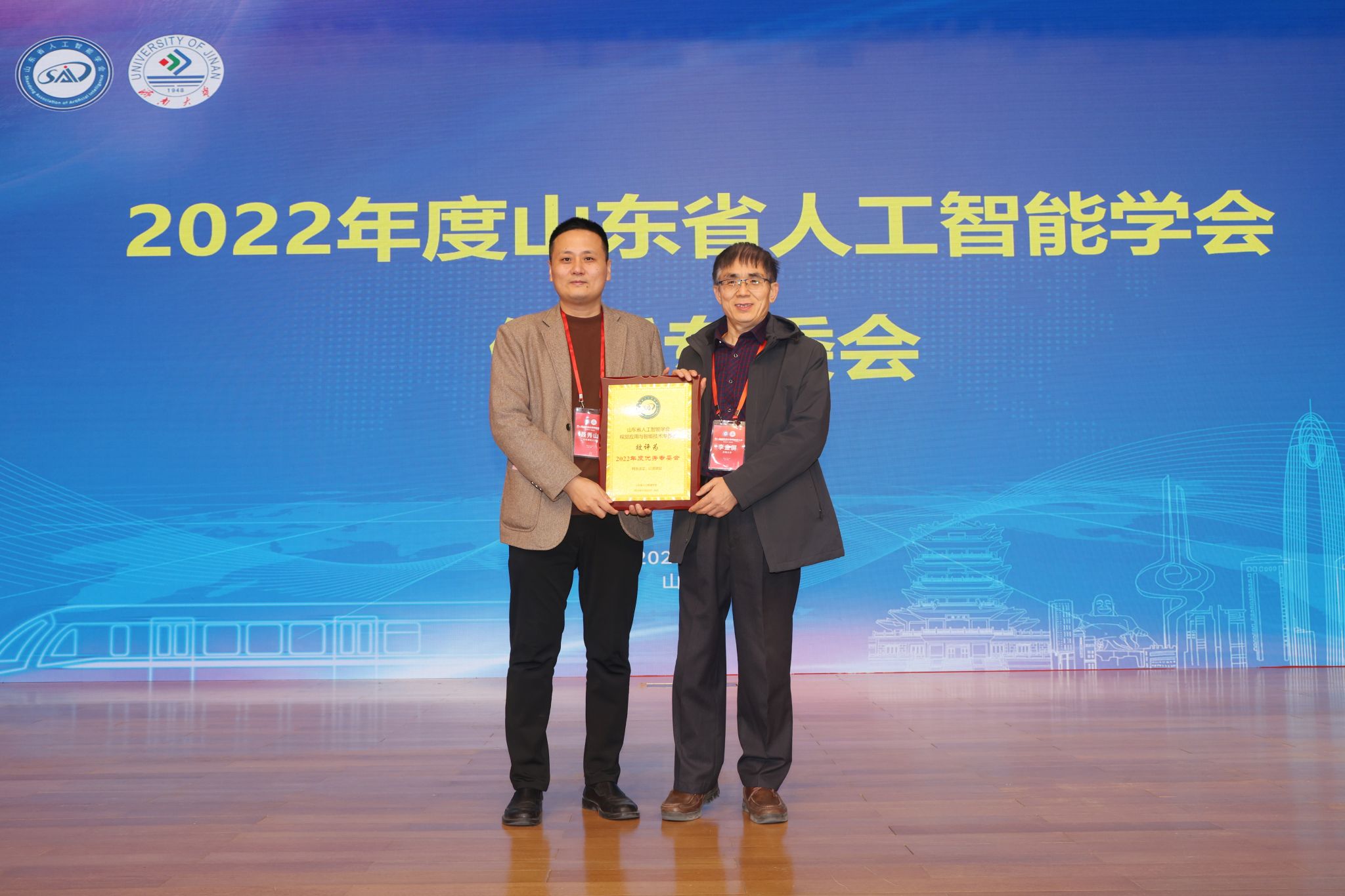 大会报告期间还进行了多项颁奖活动。我校万象城娱乐awc线路教授、视觉应用与智能技术专委会主任李金屏领取了2022年度山东省人工智能学会优秀专委会奖牌。此外,活动还为山东省计算机视觉最佳和优秀论文奖、山东省视觉创新与应用领航和先进单位颁发了证书与奖牌。