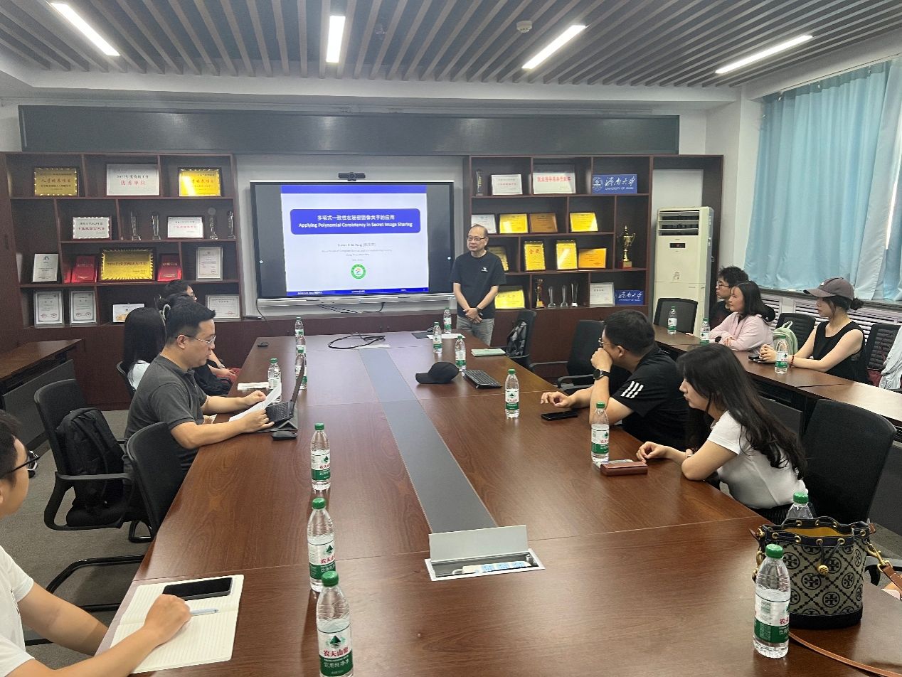 报告会上,杨庆隆教授以“多项式一致性在秘密图像共享的应用”为题,系统介绍了秘密共享(Secret Sharing, SS)和秘密图像共享(Secret Image Sharing, SIS)的基本原理与发展脉络,重点阐述了多项式一致性在多项式基础秘密图像共享(Polynomial-Based SIS, PSIS)中的关键作用。报告从数学插值原理出发,分析了多项式一致性在图像验证与安全重构中的理论依据,并详细介绍了其在三个典型研究方案中的具体应用:具鲁棒性的秘密图像共享机制、结合可逆信息隐藏的匿名申请提交机制(RP-ASAF),以及抵抗不诚实参与者攻击的指数秘密图像共享机制(ESIS)。报告内容信息丰富,体现了杨教授在图像安全与密码学领域的深厚学术积累。杨教授结合多年科研经验,耐心细致地分享了研究中所遇到的挑战与思考,进一步激发了在场科研人员的学术兴趣与探索热情。最后,参会师生围绕相关问题与杨庆隆教授展开讨论与交流。