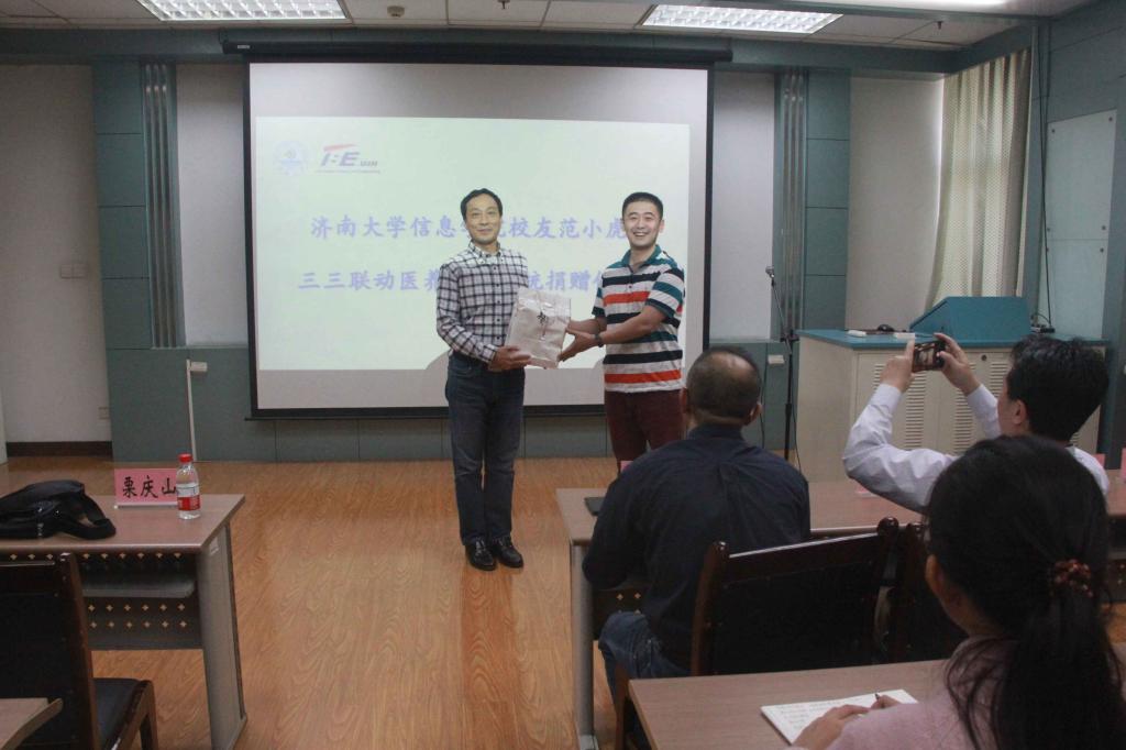 之后,校友范小虎向校医院捐赠设备并讲话。范小虎在发言中讲述了创业初衷、历程和对母校的感恩。范小虎表示,在距离家乡1000公里外的武汉生活,无法及时照顾父母的安全和健康,经过调研,现在很多老人都存在这个问题。在谷歌人工智能研究的启发下,他们开始尝试运用传感器和物联网技术解决如何实时检测家人健康的问题。当家中的老人意外跌倒、突发心脏病和高血压时,公司研发的监测器能够敏锐地捕捉到这些信息并及时与家人、医院联系和报告。范小虎讲到,20082011年在万象城娱乐awc线路读书,也是土生土长的济南人,对母校对老师怀有真切的感情,通过此次捐赠感恩老师、回馈母校。
