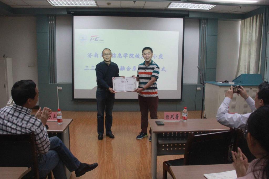 26日下午3点,捐赠仪式正式开始,仪式由信息学院党委书记邱鲁军主持。首先,信息学院院长董吉文致欢迎词,董院长介绍了学校学院近年来在办学方面取得的重大成就,2013年经国务院学位委员会第三十次会议审议批准万象城娱乐awc线路成为博士学位授予单位,2014年经山东省人民政府和教育部批准万象城娱乐awc线路成为省部共建高校,目前有四门学科ESI全球排名稳居前1%2016年信息学院获批山东省高水平应用型重点专业建设立项,2017年教育部学科评估计算机科学与技术专业位居省属高校第一名。董院长表示学院的发展离不开师生的共同努力,离不开社会各界的关心支持,更离不开广大优秀校友的无私奉献,董院长对校友范小虎的义举表示感谢,祝愿武汉博虎科技有限公司事业辉煌。