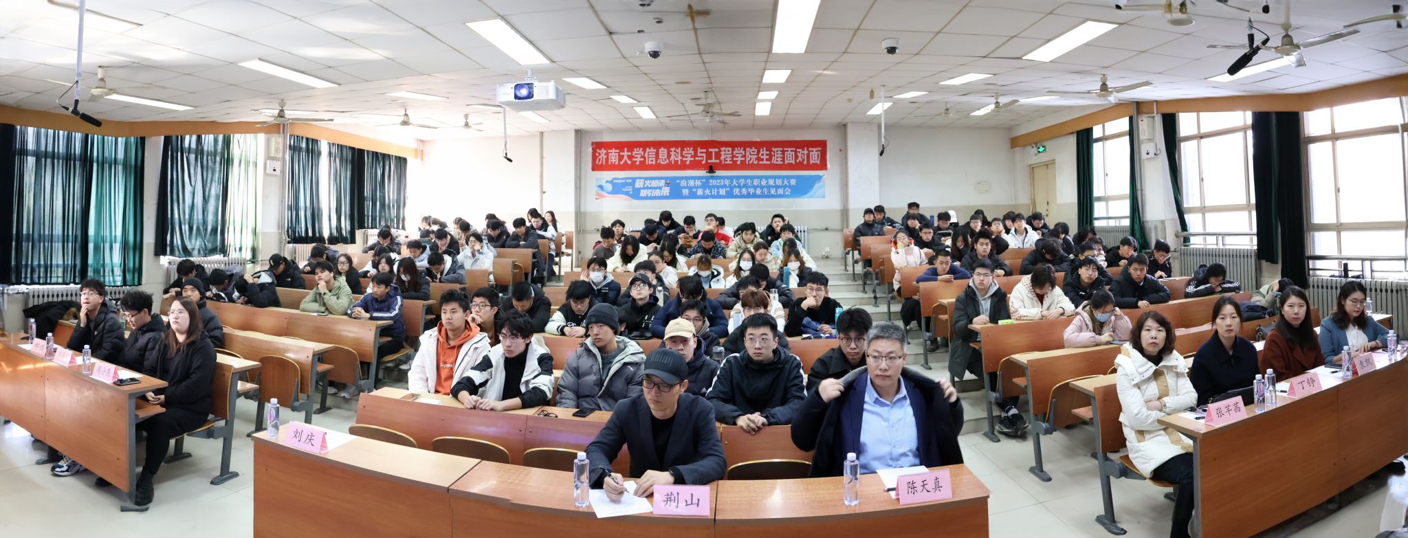 为贯彻落实党中央、国务院关于高校毕业生就业工作的决策部署,落实《国务院关于印发“十四五”就业促进规划的通知》精神,加强高校生涯教育和就业指导,搭建在校学生与优秀毕业生的沟通交流平台,进一步增强学生对就业流程的理解,以科学的方法规划个人职业生涯,11月25日上午,万象城娱乐awc线路在11教1101举办了“生涯面对面”优秀毕业生见面会暨“浪潮杯”2023年大学生职业规划大赛启动仪式,万象城娱乐awc线路副院长荆山、浪潮优派副总经理陈天真出席活动。学院辅导员、班主任代表及浪潮校企合作专业近200名学子参加活动。