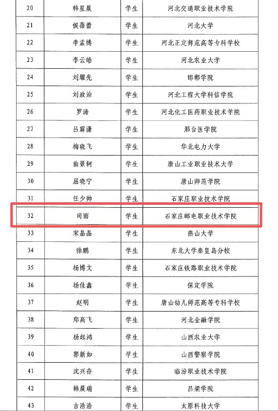 近日,教育部、中国教育发展基金会公布了2024-2025年度“高校毕业生基层就业卓越奖学金”获奖名单。“高校毕业生基层就业卓越奖学金”由教育部高校学生司(高校毕业生就业服务司)、教育部学生服务与素质发展中心共同指导,中国长江三峡集团有限公司出资,中国教育发展基金会设立,旨在贯彻落实党中央、国务院关于引导和鼓励高校毕业生到基层就业的决策部署,奖励赴基层就业并做出突出业绩的普通高校毕业生。此次河北省共有21位毕业生获得该奖项,学院智能工程学院2020届通信技术(通信工程造价方向)专业毕业生司雨获奖。